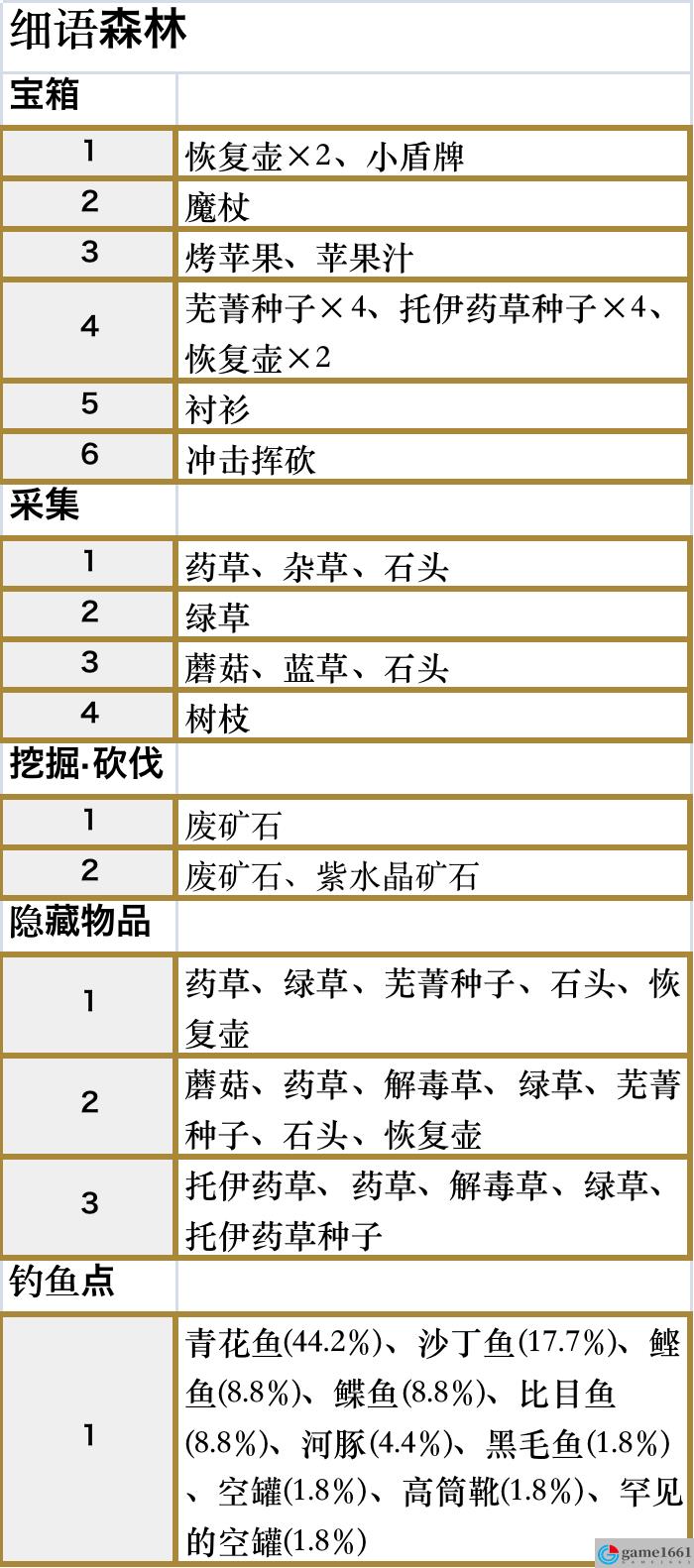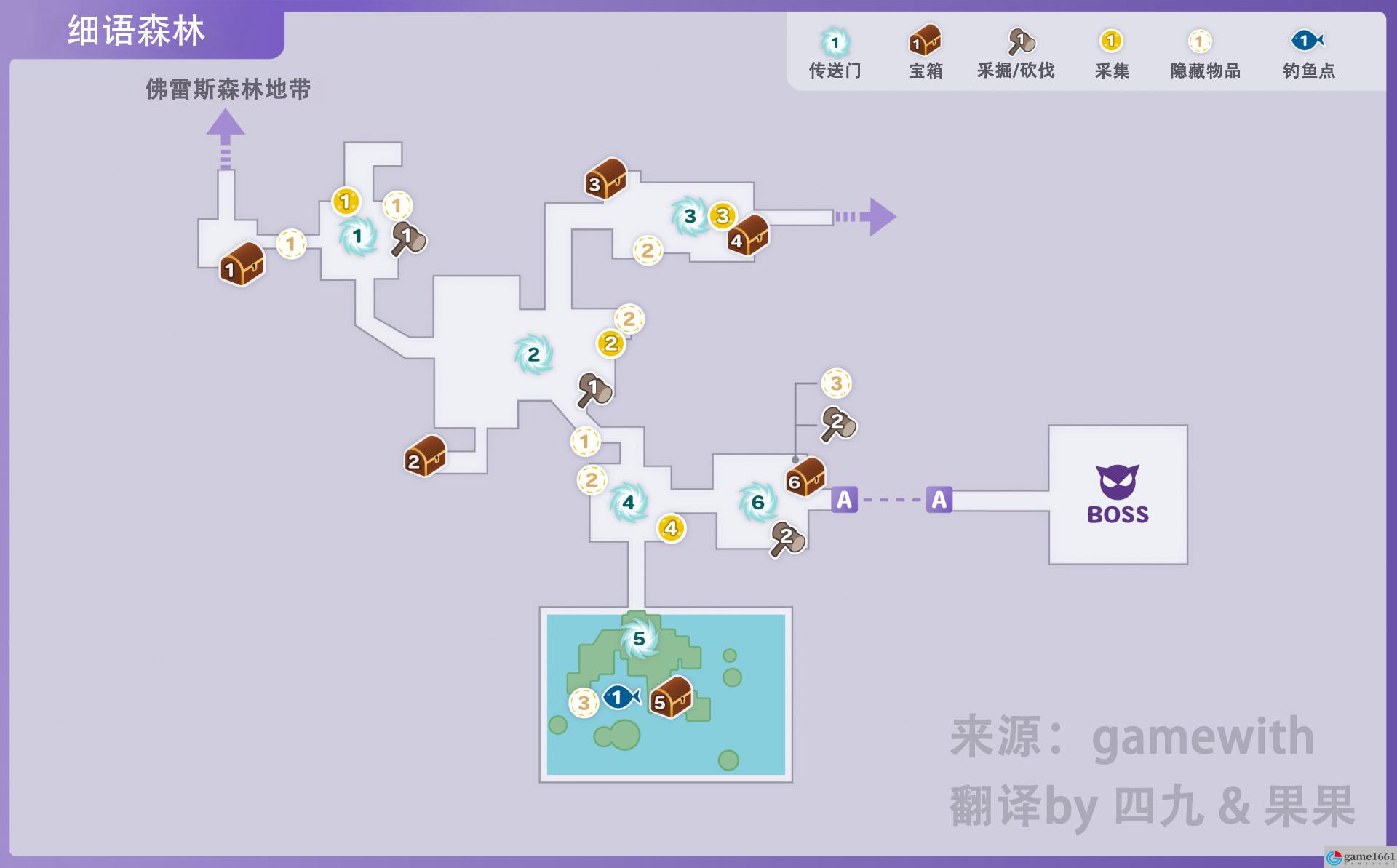 《符文工廠5》中的細語森林是游戲里有非常多重要道具和素材的地方,裡面的寶箱、傳送門、採集點、隱藏道具和釣魚點非常多,想要全收集的話只需要按照如下圖的全收集地圖找就可以了。