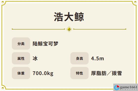 《寶可夢:朱/紫》中的浩大鯨是游戲里非常強大的一種陸鯨寶可夢,是寒冰道館館主古魯夏的主力寶可夢,而這個寶可夢的特點就是可以以龐大的身軀來進行物理攻擊,攻擊有著極高的威力。