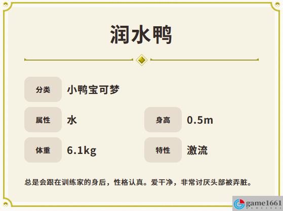 《寶可夢:朱/紫》這款游戲的新御三家分別是新葉喵、呆火鱷和潤水鴨,而水屬性的潤水鴨是很不錯的選擇,潤水鴨的特點就是由羽毛分泌出的凝膠有防水和防污的效果,而且性格非常認真,而且非常愛干凈,非常討厭頭部被弄臟。