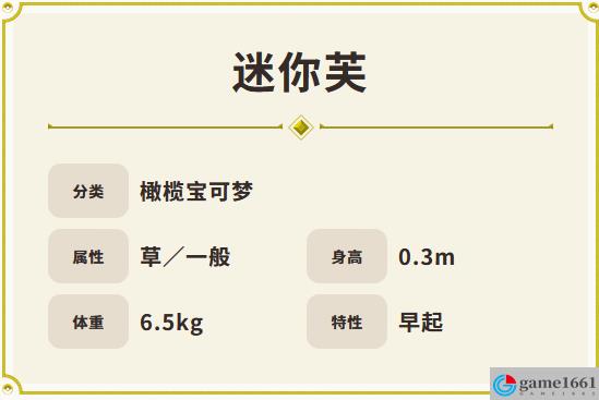《寶可夢:朱/紫》中的迷你芙是游戲里看起來很可愛的一個草屬性寶可夢,特性是早起,而它的特點就是在受到驚嚇或者被襲擊的時候會直接噴射出一種油來讓敵人的動作直接變得遲緩,然後趁機逃跑。