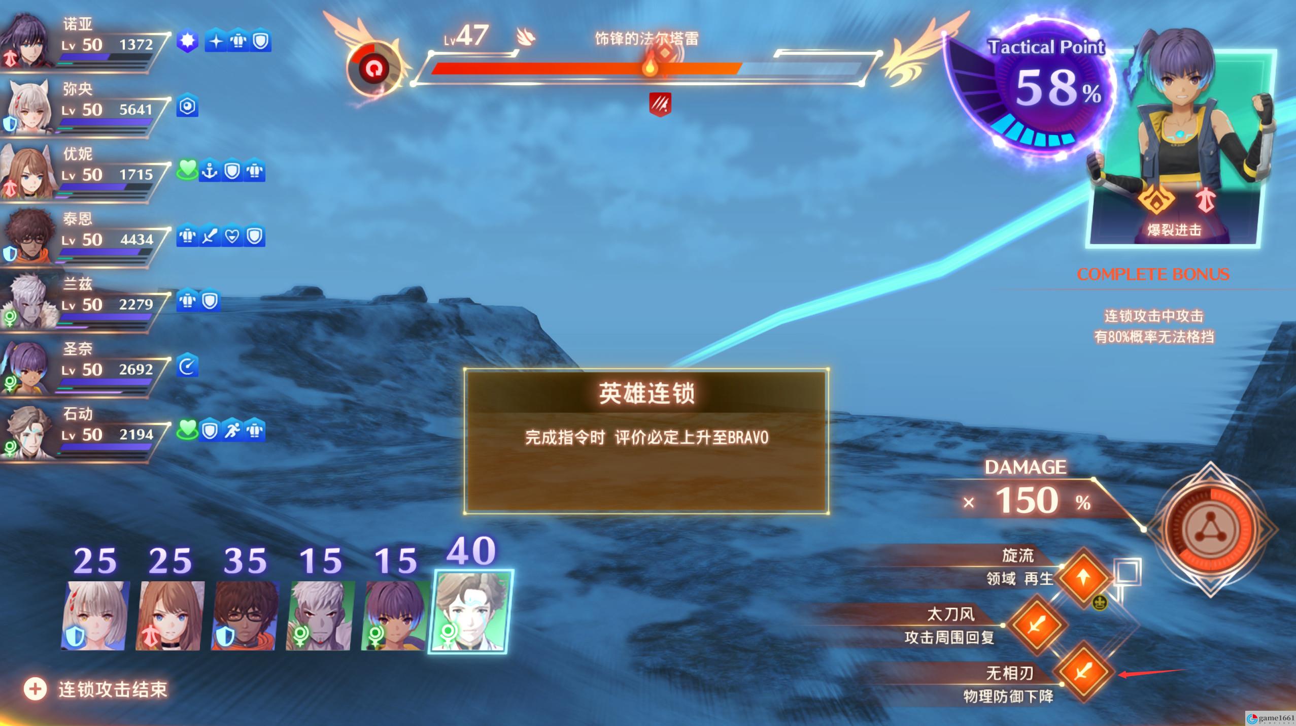 這里諾亞打了58,然後我們選石動,貪一點就用減物理防禦的戰技,輕松打100,並且靠石動的英雄連鎖上150,兩個人打出150,那麼兩個人都能穩定回歸了,等於白嫖一輪。下一輪就有了58的輸出了。