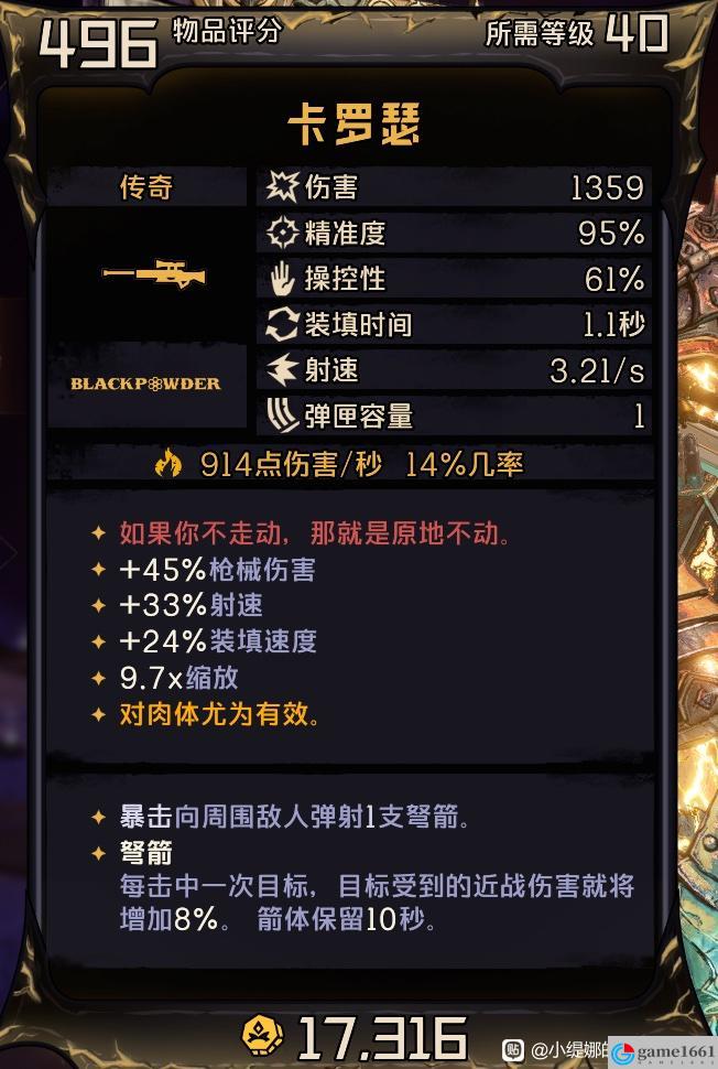 《小緹娜的奇幻之地》中游戲里好用的強大遠程武器是很多的,卡羅瑟就是其中一個很不錯的橙色武器,正常效果是暴擊會向周圍敵人彈射1支弩箭,被弩箭打中的人會受到近戰受到的傷害+8%的DEBUFF。