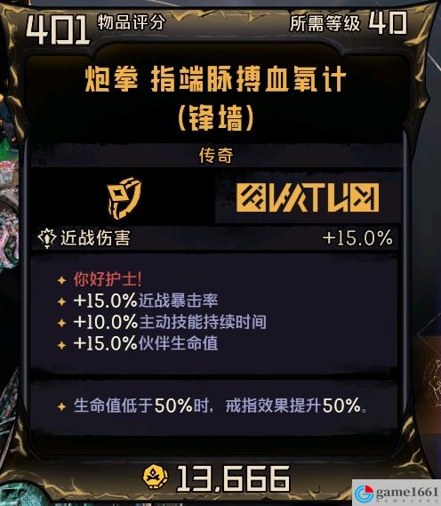 《小緹娜的奇幻之地》中比較獨特的傳奇道具是很多的,指端脈搏血氧計就是其中一個,效果是能增加近戰傷害、近戰暴擊率、主動技能的持續時間和夥伴生命值,血量低於50%戒指效果還能提升50%,紅字效果暫時未知。