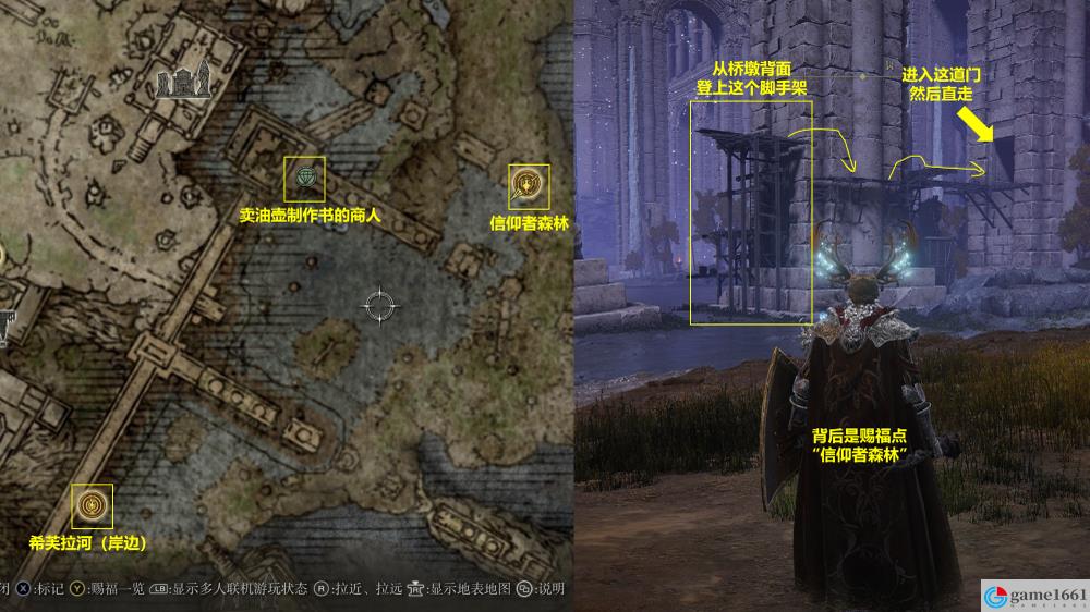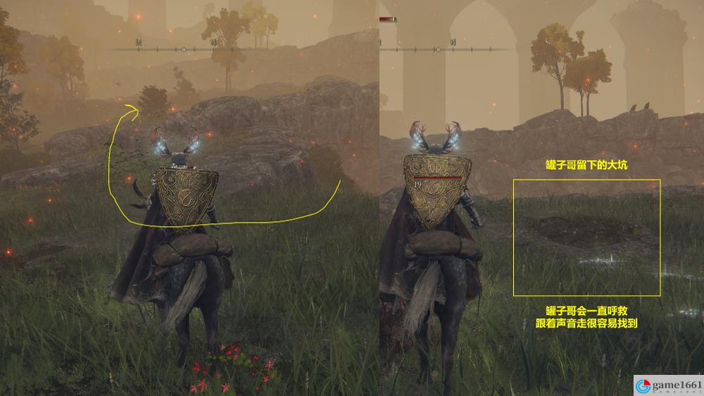 1、在寧姆格福聖人橋附近探索時會聽到呼救,在圖示位置附近會發現陷在泥土中的亞歷山大。和他對話,他會請求我們用武器將他錘出去。我比較推薦用大型武器,比如大劍大錘之類的,對準亞歷山大用重攻擊。大概打個兩三次,亞歷山大就會被錘出去。