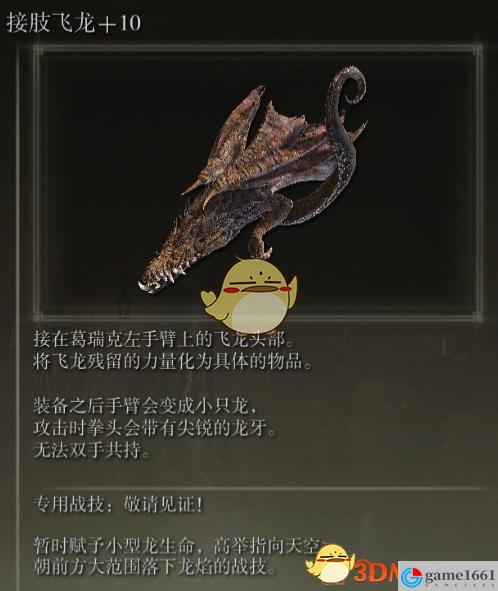《艾爾登法環》中的接肢飛龍是游戲里很少見的拳套類武器,不過說白了還是玩具,打完葛瑞克之後用追憶兌換就行了,戰技敬請見證用出來就是暫時賦予小型龍生命,高舉指向天空,朝前方大范圍落下龍焰。