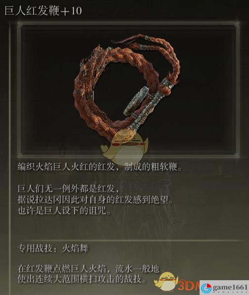《艾爾登法環》中的巨人紅發鞭是游戲里很不錯的一種鞭子類武器,用的材料還是火焰巨人的頭發,戰技火焰舞用出來就是在紅發鞭點燃巨人火焰,流水一般地使出連續大范圍橫掃攻擊,能連揮六次,不過使用時間太長了。