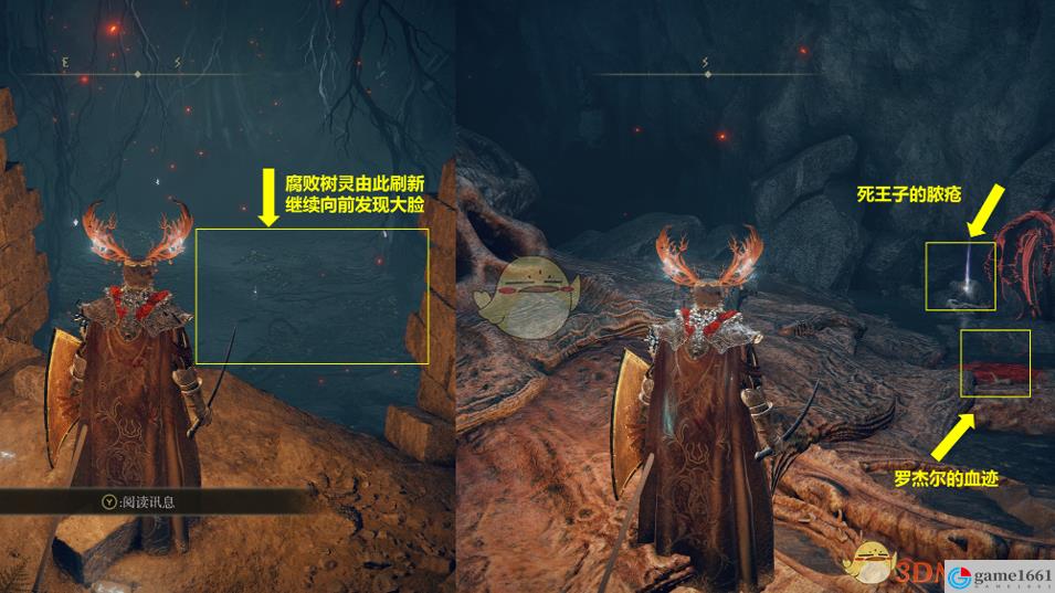 4、從擊敗腐敗樹靈的地方繼續向前,會看到一張畸形大臉。調查大臉附近的一灘血跡,會發現是羅傑爾的死亡畫面。撿起血跡附近的死王子膿瘡。