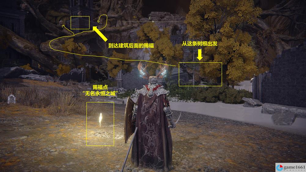 9、探索「深根底層」,一路向上,找到賜福點「樹根前路」。賜福點前方可以走進一大片空地,不斷向前跑,開啟一場BOSS戰。