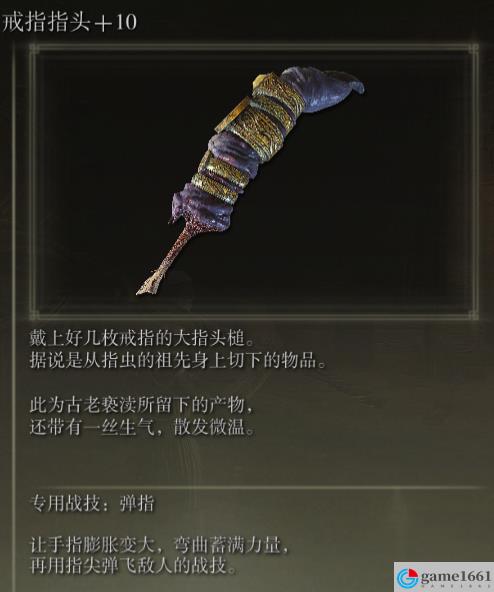 《艾爾登法環》中的戰技彈指是游戲里戒指指頭的專屬戰技,屬於是玩具類的武器,用出來之後就是讓手指膨脹變大,彎曲蓄滿力量,再用指尖彈飛敵人,動作太慢了,而且傷害也不算高,不過PVP被這玩意兒崩死絕對是恥辱。