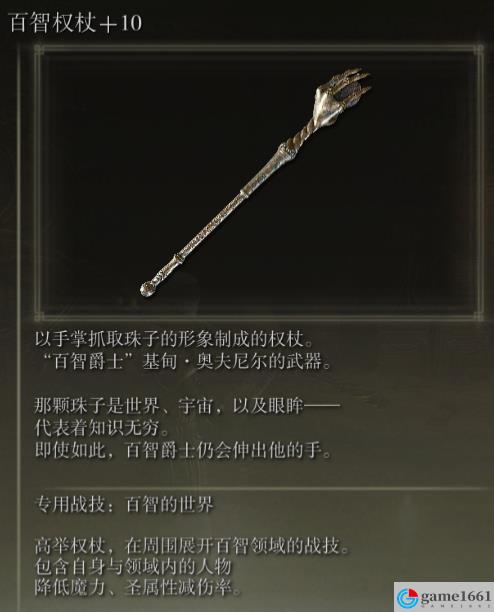 《艾爾登法環》中的戰技百智的世界是游戲里百智權杖的專屬戰技,屬於是非常腦癱一個戰技,用出來之後就是高舉權杖,在周圍展開百智領域,包含自身與領域內的人物降低魔力、聖屬性減傷率。