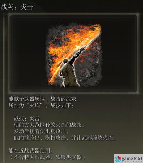 戰灰炎擊是一個很實用的戰技,先迅速的放出一陣火,之後可以通過重擊橫掃,之後可以給武器提供火焰附魔,兩段傷害疊加傷害還行,可以達到1000+,三發可以打出肥仔處決,而且火屬性在打一些特定敵人有奇效。