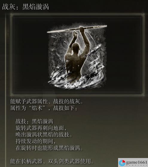 《艾爾登法環》這款游戲中好用的強大戰技是很多的,黑炎漩渦就是其中比較獨特的一個,屬於是喚起風暴的黑炎版本,用出來就是旋轉武器再刺向地面,然後喚出漩渦狀黑焰,另外在持續發動的期間,在旋轉時也能形成黑焰漩渦。