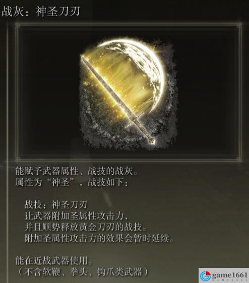 戰灰神聖刀刃是前期就能拿到的挺不錯的聖屬性戰技,放出一道中等距離的劍氣,之後提供聖屬性附魔,打骷髏可以直接打死,前期下墓很有用,但施展動作挺長的,而且傷害一般,聖屬性附魔也很短,而且多數敵人有神聖屬性的抵抗,所以也就拿來下墓用了。