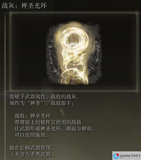 《艾爾登法環》中好用的神聖類戰灰都是非常好用的,神聖光環就是其中一個,屬於是尊腐騎士的指揮官使用的戰技,用出來就是讓武器形成神聖光環直接朝前方釋放,另外還可以連續施放。