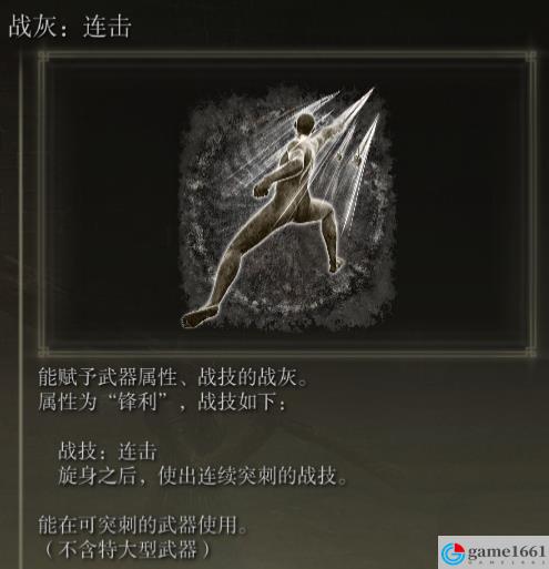 《艾爾登法環》中的戰灰戰技連擊是游戲里比較獨特的,使用之後就是旋身之後,直接使出連續突刺的戰技,傷害很低,如果給武器上一些獨特的附魔,然後再用這個戰技還算不錯,可以上一個BUFF。