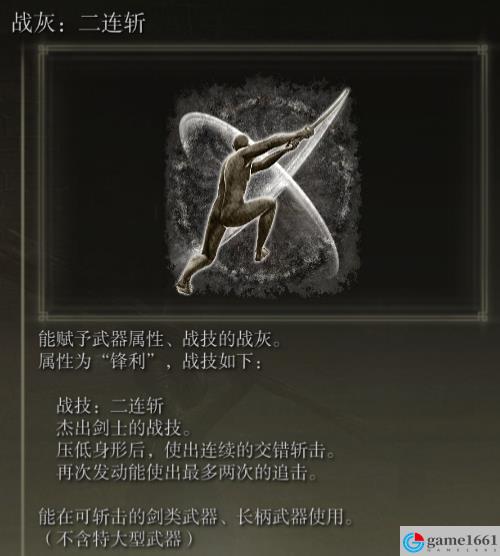 二連斬屬於是屍山血海青春版,說是二連斬,實際完整一輪應該砍了有六七下,一整套完整的打完傷害很高,+25的大劍砍一輪能出2600+的傷害,過程中有韌性,但是壓根砍不出惡兆之子的硬直,打那種硬直很大的對手應該很好用。