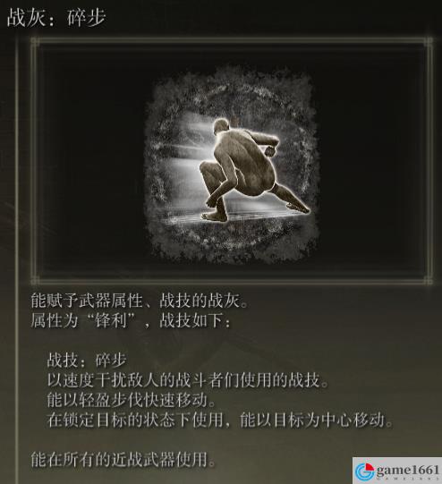 《艾爾登法環》中的戰灰碎步是游戲里非常好用的,不過因為有獵犬步伐,它的地位就有些尷尬,移動距離沒有獵犬長,無敵幀也沒有獵犬步伐長,不過獵犬步伐不太好控制,某些時候貼身打微操的時候碎步就很有用了。