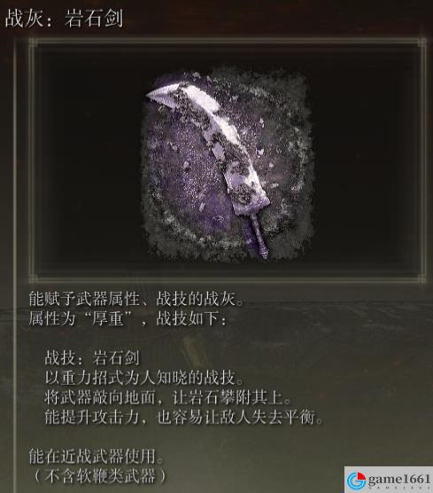 《艾爾登法環》中好用的強大戰灰是非常多的,戰灰巖石劍就是其中一個,屬於是加持類的特殊戰技,往地上一砸,然後用巖石附著在劍上就能提升攻擊力和削韌,攻擊力是看出來了,削韌倒是沒看出來。