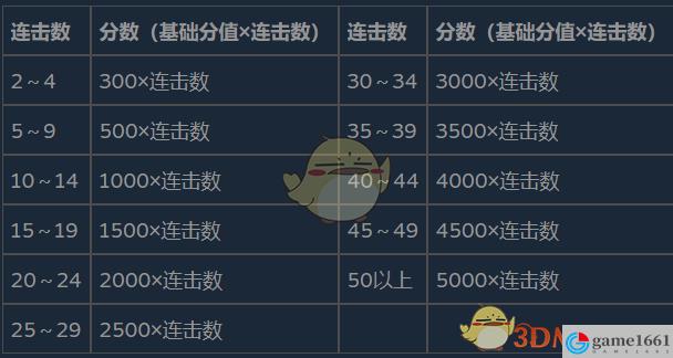 礎分值×連擊數=連擊獎勵分,具體規則參看下錶。舉例說明,如果達成24連中斷,連擊獎勵分數為48000;如果分別達成9連和15連,中途發生過中斷,雖然同樣是擊倒了24個敵人,但連擊獎勵分數只有4500+22500=27000