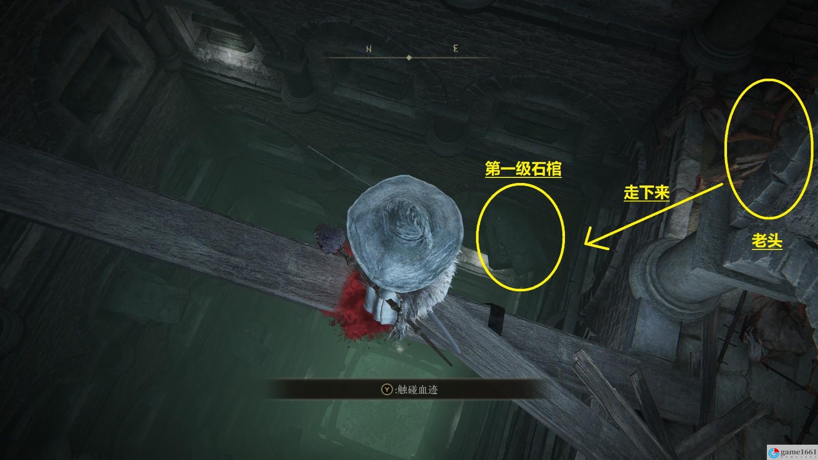 隨後一路向下順著墓碑和木板跳躍。求穩的話,首先先走模板直到無路可走,這時候可以發現一個彈琴老頭。從他身邊蹭到下方的石棺上,沒什麼難度。