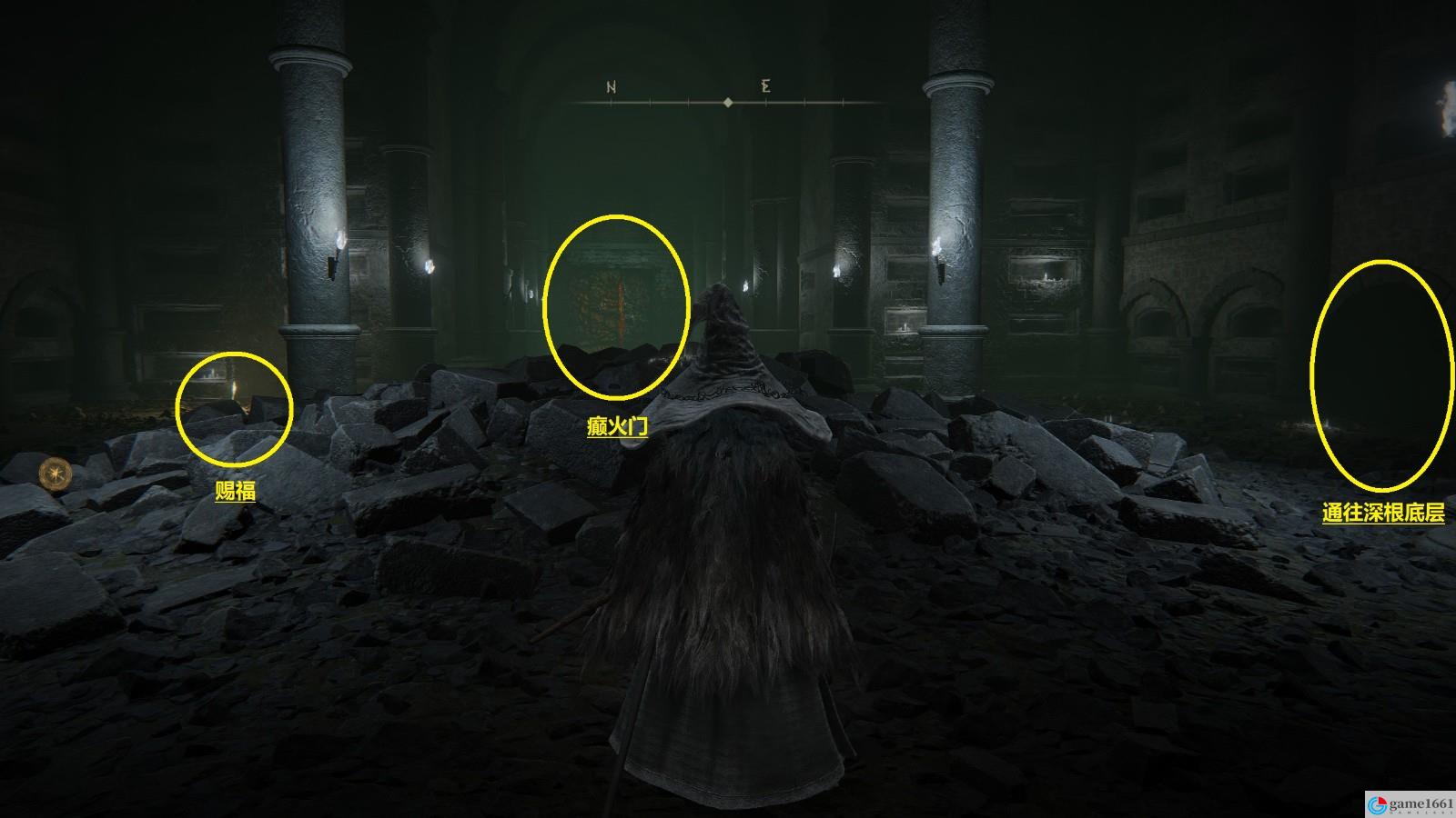 到達最底層即為【癲火封印】的賜福。記住點了賜福但是先不要脫衣服進門,等打完最終Boss再進門都來得及。右側有一個隱藏墻壁有一個寶箱,寶箱後面是通往深根底層的隱藏墻壁,經典大樹洞設計。