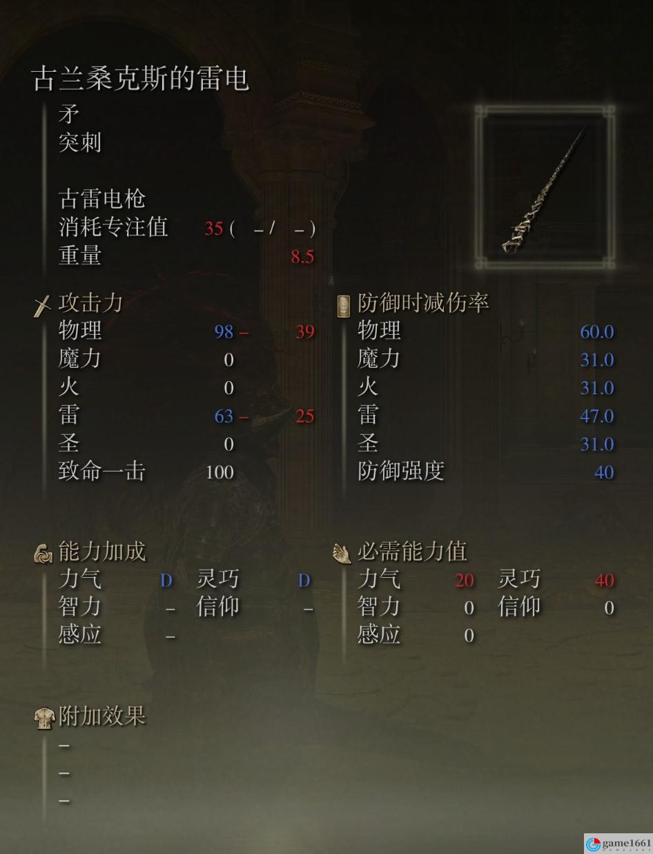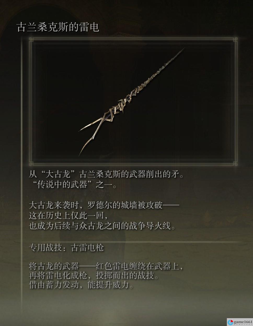 古蘭桑克斯的雷電武器需要去王城,然後從黃金大教堂西側坐電梯下去,到有隱身怪的地方,向下跳到到巨型弓箭雕像上走過去拾取。