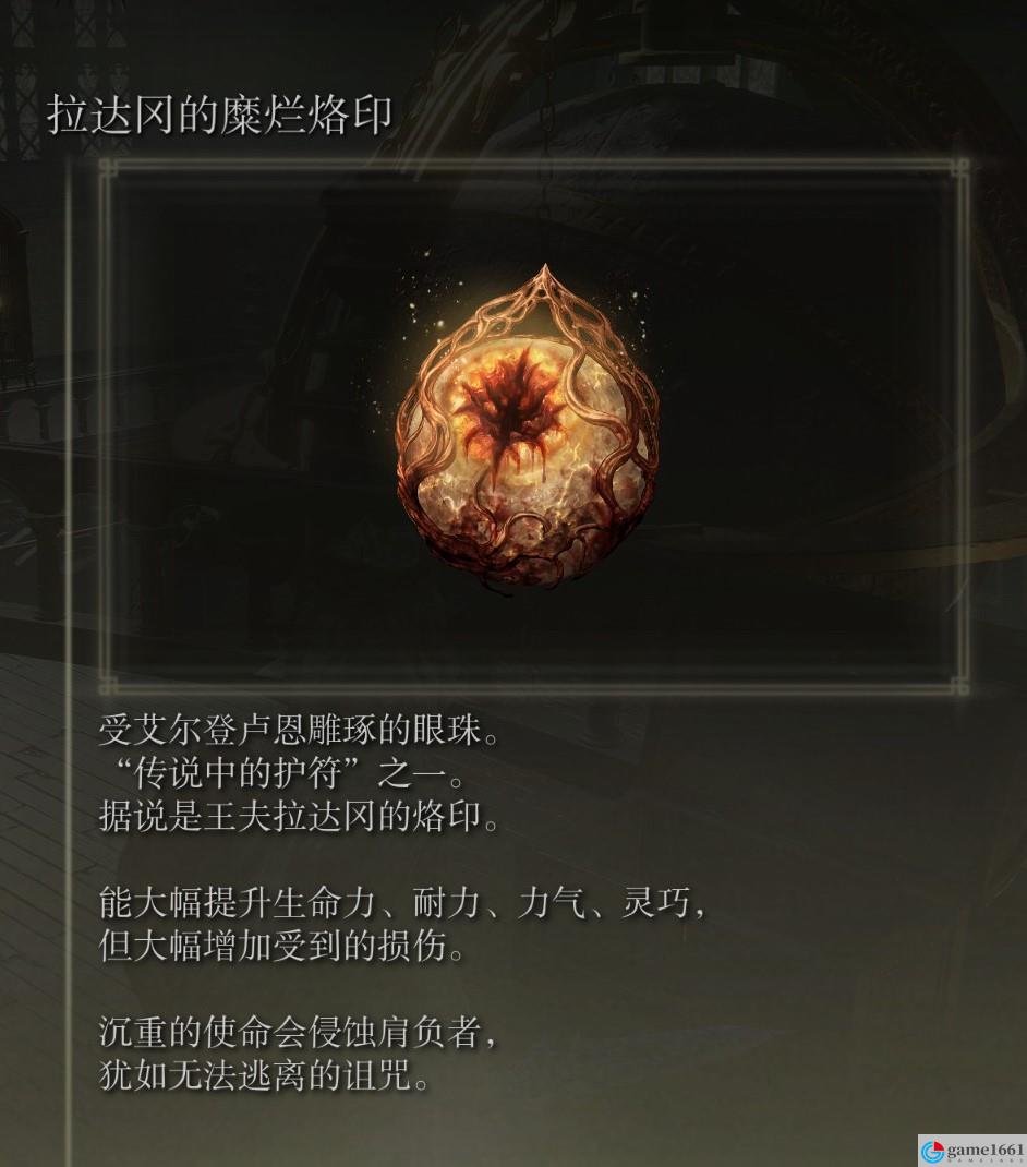 《艾爾登法環》中的拉達剛的烙印是游戲里非常獨特的強大護符,效果有點類似於古達鎖鏈,能夠直接提升生命力、耐力、力氣和靈巧,不過受到的傷害會直接加倍,想要獲得需要去啜泣平原的封印監牢。