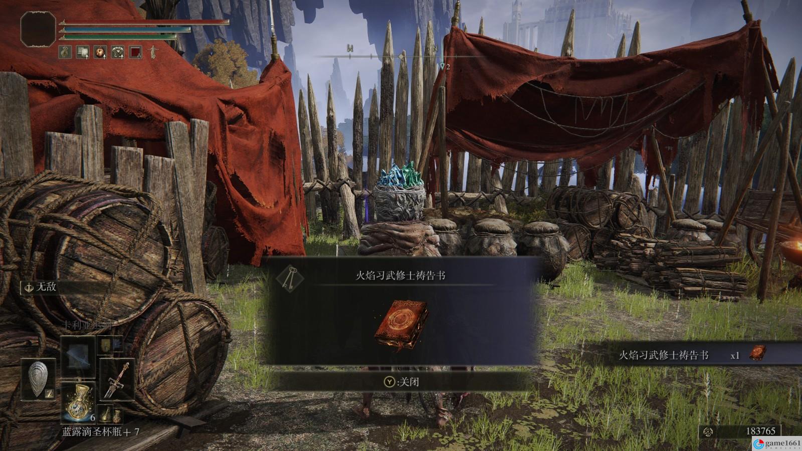 湖之利耶尼亞的小偷封印監牢旁邊有一個火焰營地,玩家在裡面的屍體上就可以撿到火焰習武修士禱告書。