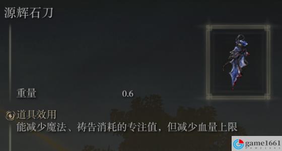 源輝石刀 減少消耗專注值最低20%到最高25%,魔法或禱告所需的專注值越高減少的消耗就越高。