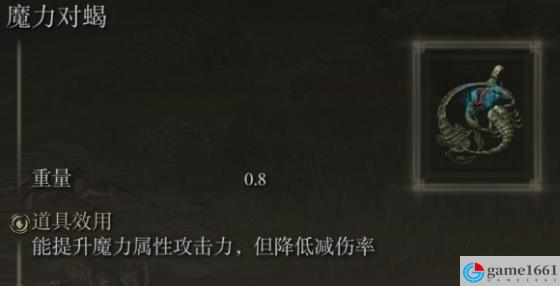 魔力對蠍 提升魔力屬性攻擊力12% 對蠍各有4種,魔力、火、雷、聖,提升皆為12% 可用於魔法、禱告、戰灰傷害提升。