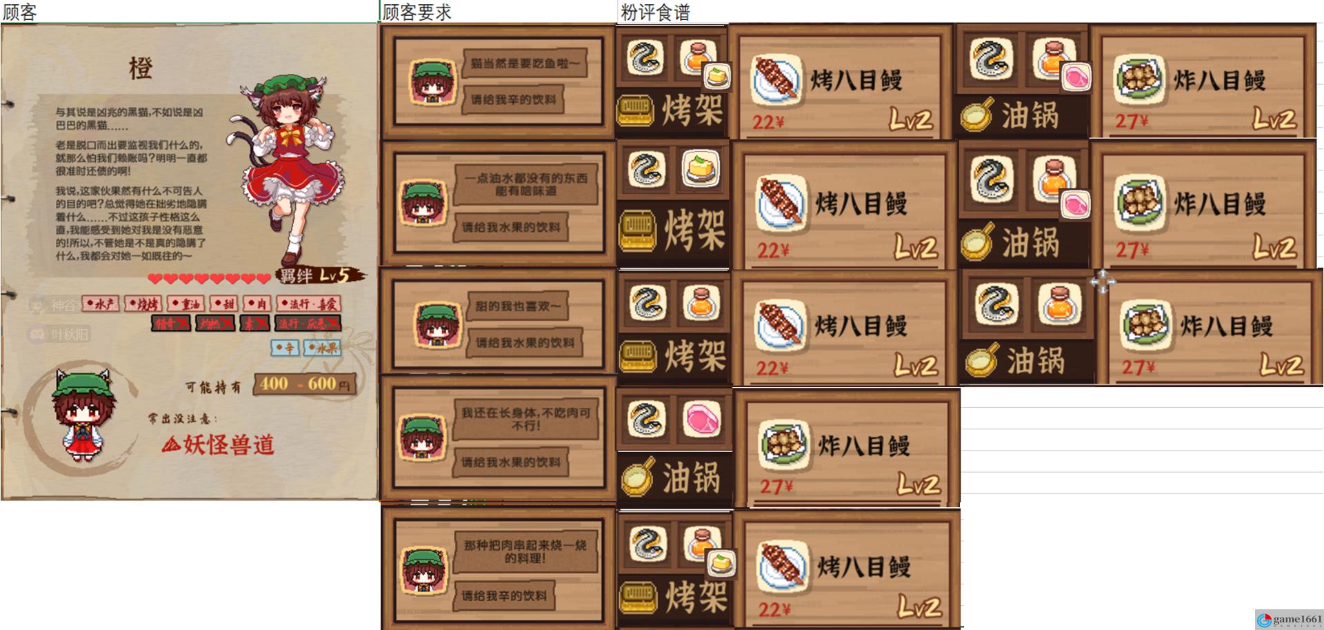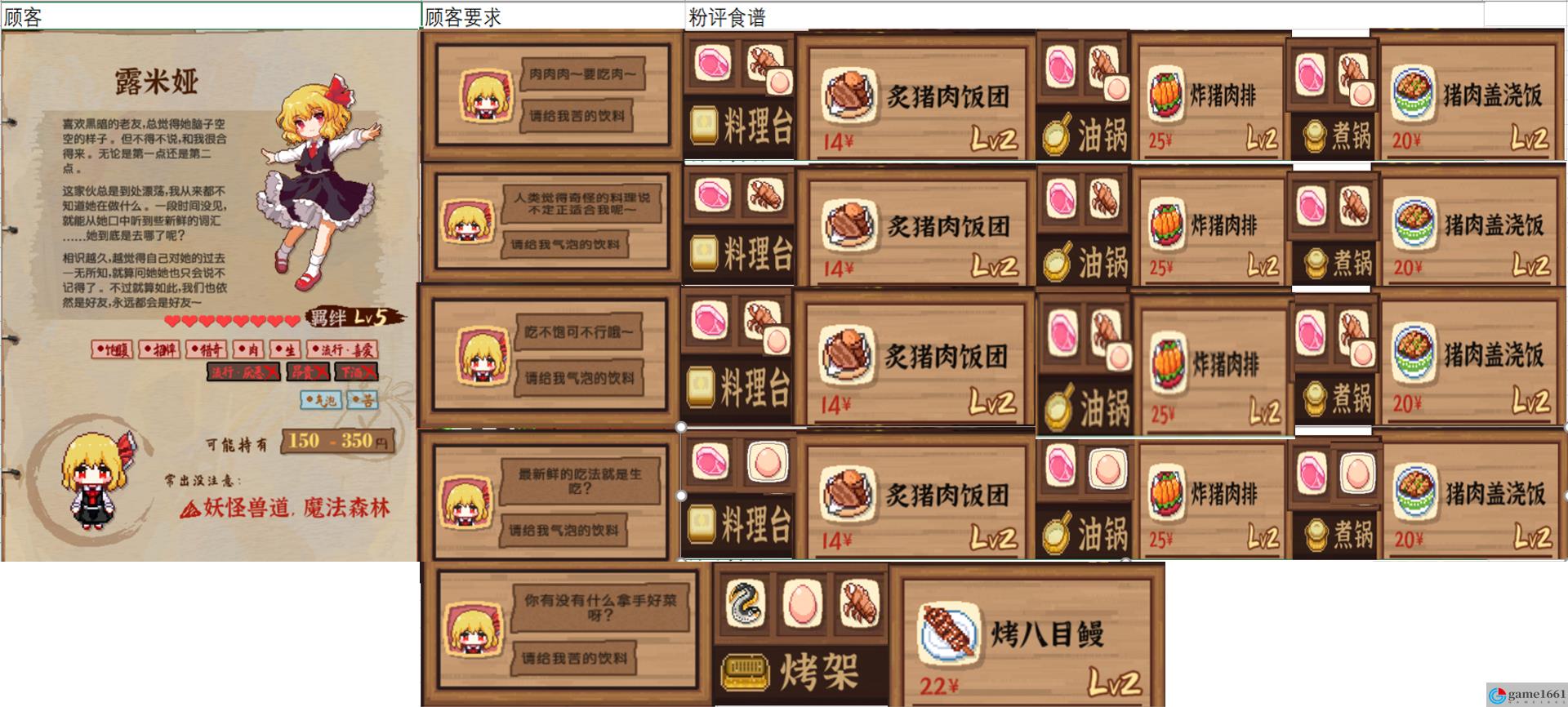 《東方夜雀食堂》中有很多的解鎖的菜譜,每種菜譜製作的方式也不同,而某些菜譜做起來很難,某些菜譜基本上是必完成的,比如:豬肉蓋澆飯,炸豬排,考八目鰻都是比較好評的食材。