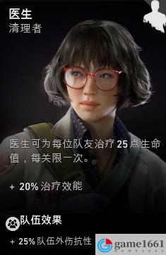 《喋血復仇》中醫生是游戲里非常好看的一個妹子,能力也非常不錯,屬於是典型的醫療專精角色,她的團隊技能的效果是增加全隊的外傷抗性,這個能力可以幫助隊友保持更健康的血量,噩夢難度可能作用不大。