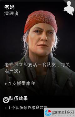 《喋血復仇》中的老媽是游戲里非常好用的一個輔助類角色,屬於是噩夢超神角色之一,隊伍能力的效果是全隊+1倒地次數,而且在沒有倒地次數的噩夢難度中也可以大幅度減少翻車的幾率。