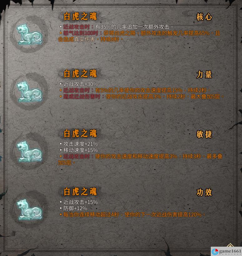 《暖雪》中的聖物白虎之魂是游戲中非常獨特的四聖獸聖物,基本上什麼流派都可以用,其中比較好用的就是核心白虎之魂,效果是當你近戰攻擊的時候有35%的幾率可以追加一次額外的攻擊。