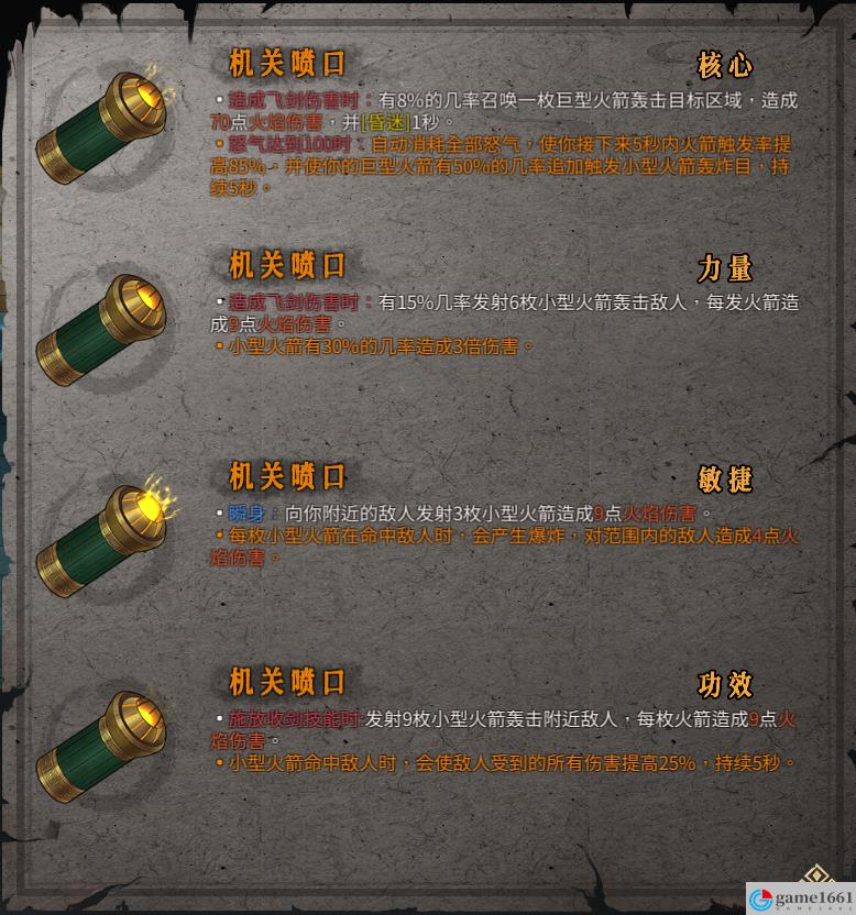 《暖雪》中的聖物機關噴口是游戲里非常特別的聖物,一共有四種,每種的效果都不太一樣,核心機關噴口的效果有很多,可以在造成飛劍傷害時有8%的幾率召喚一枚巨型火箭轟擊目標區域,造成高額傷害,並且有一個眩暈。