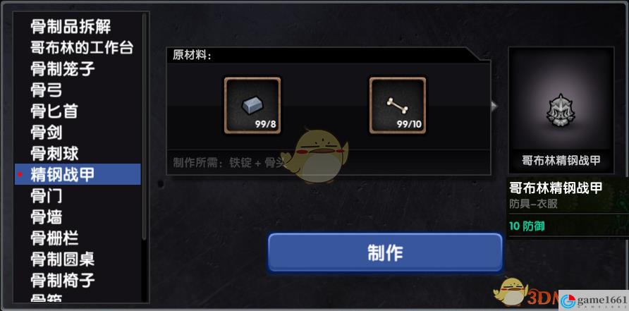 精鋼戰甲(哥布林精鋼戰甲)需要8個鐵錠+10根骨頭,配合異變黏膜 可以用很久,真的很久。基礎防禦10點,配合鐵手套和鐵靴就是20點防禦,如果是野豬人在帶上厚皮 25點防禦,有木有!厲不厲害!