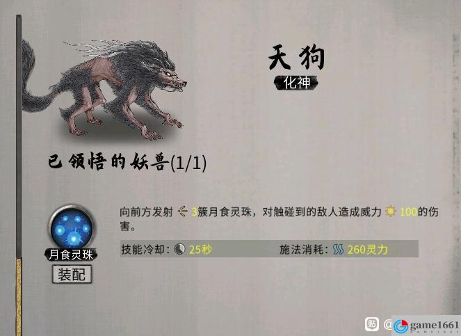 《鬼谷八荒》中的昊天眼是游戲里非常強大的神器,功能也有很多,比較重要的一個能力就是學習妖獸的技能,比如天狗的技能月食靈珠,月食靈珠可以向前方發射3簇月食靈珠,對觸碰到的敵人造成威力100的傷害。