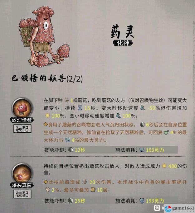 在腳下種1棵蘑菇,吃到蘑菇的友方(僅對召喚物生效)可能變大或變小,持續15秒。變大時移動速度50%但傷害增加100%,變小時移動速度增加區100%。
