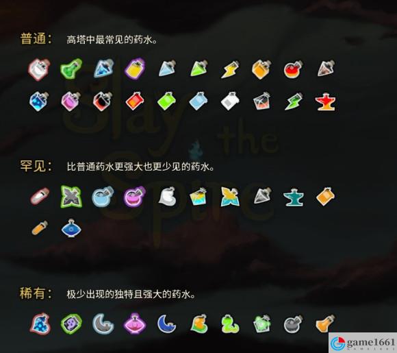 藥水的稀有度如下圖所示。你可以在尖塔主介面的【百科大全】→【藥水研究所】以查閱藥水的詳細信息。