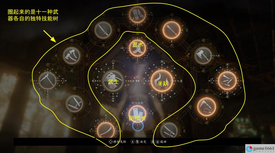 除了這11個武器技能樹之外,還有4個通用技能樹,也就說這4個技能樹里的技能只要點出來無論使用任何武器都能生效,這四個技能樹分別是:武士、半妖、忍術、陰陽術,其中忍術和陰陽術比較特殊,涉及到術道具的使用,後面會講。