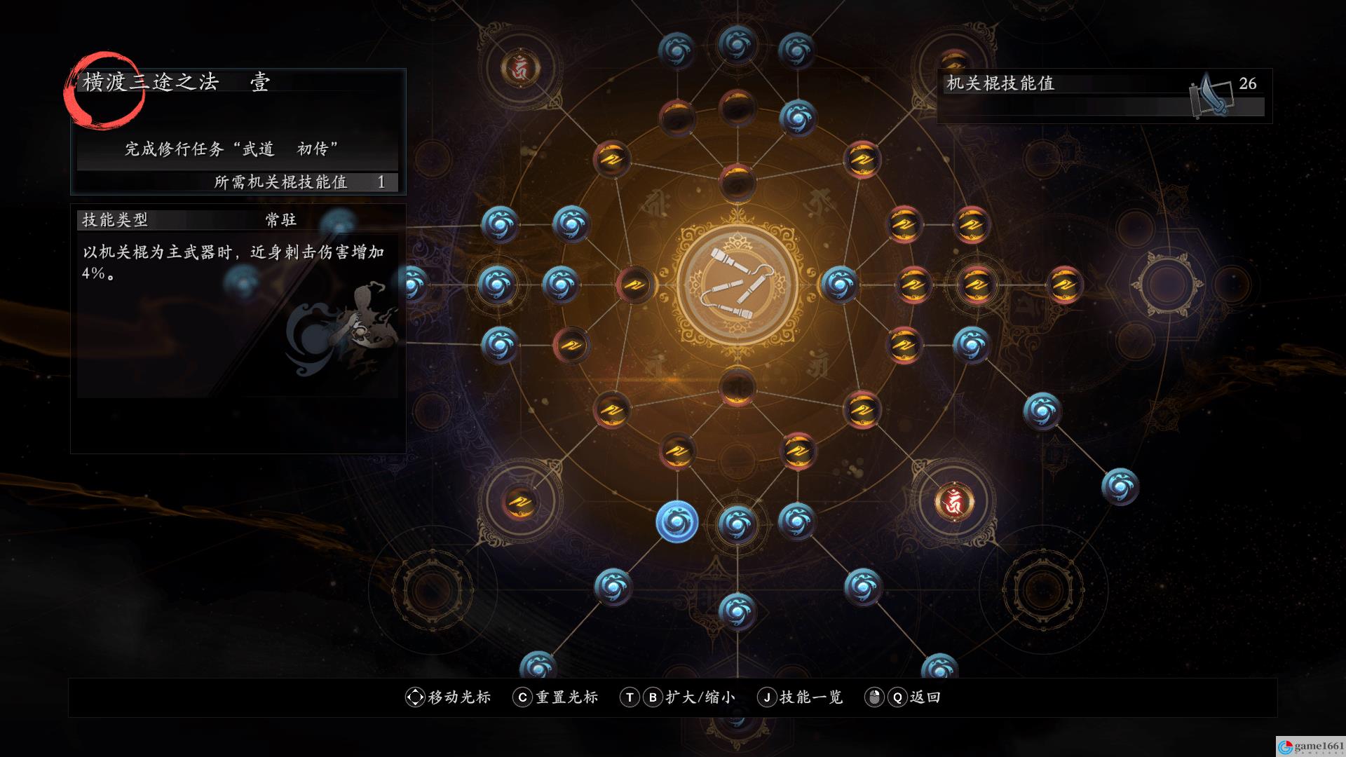 如上圖,被圈起來的是十一種武器的獨立技能樹,在武器技能樹里學習的技能只能在使用對應武器時生效,無論是主動還是被動,比如說如下圖,我在機關棍的技能樹里學習了 「橫渡三途之法 壹」 ,效果是近身刺擊傷害增加4%,那麼我在接下來的游戲中使用機關棍的話,我就能享受到這個加成,如果使用的是其他武器的話就沒有這4%的加成