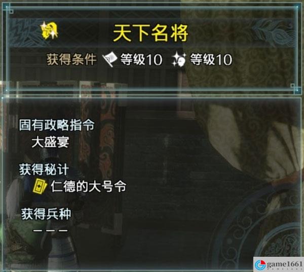 天下名將的固有政略指令「大盛宴」為可以提高同勢力全部武將的友好度的政略,雖然需要消耗大量兵糧和金錢,但可以省去和每個武將散步交流的步驟,同時仁德也可以大幅提升,為了在中期~後期與發動其他武將的「援手」,推薦使用。