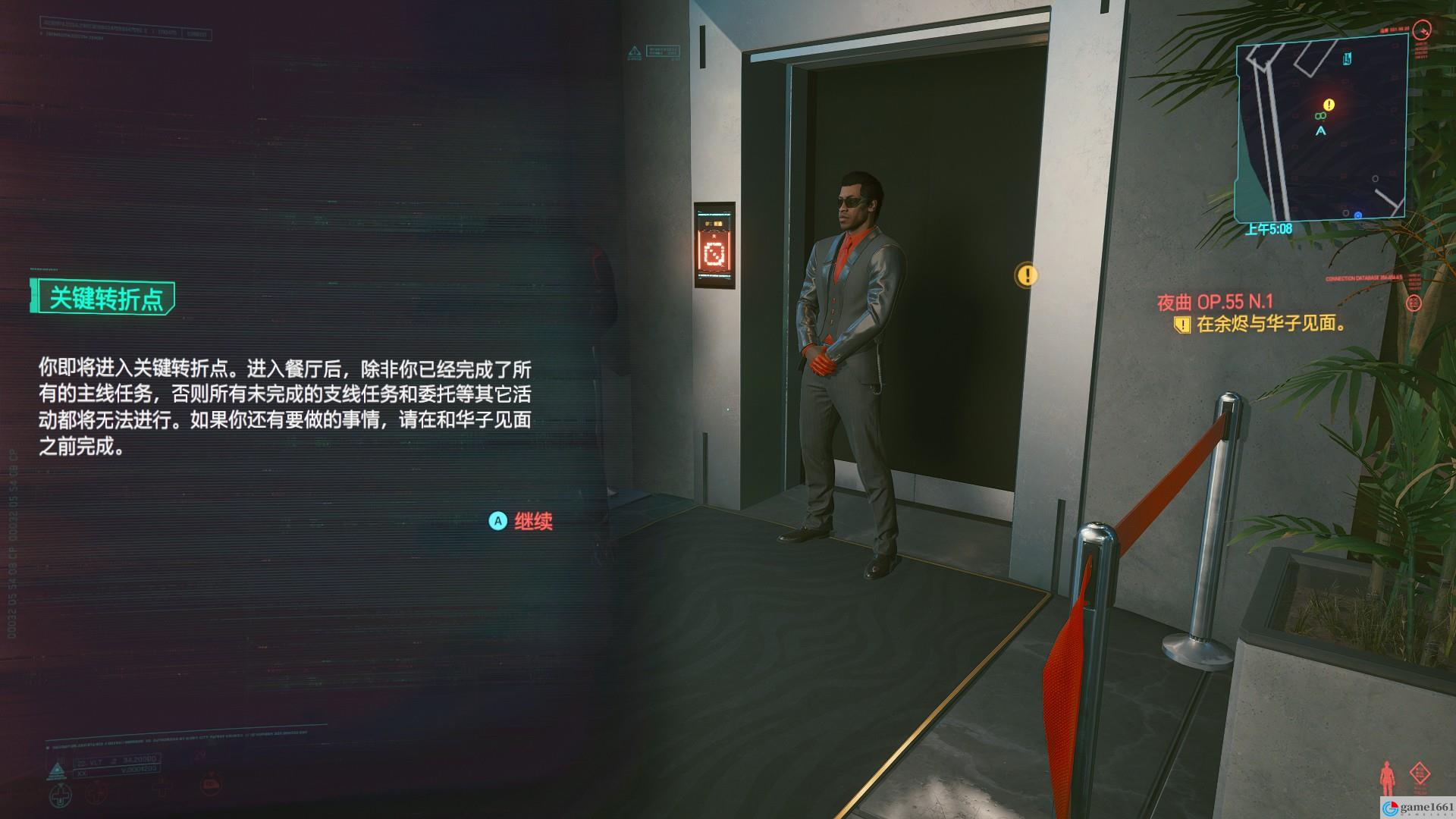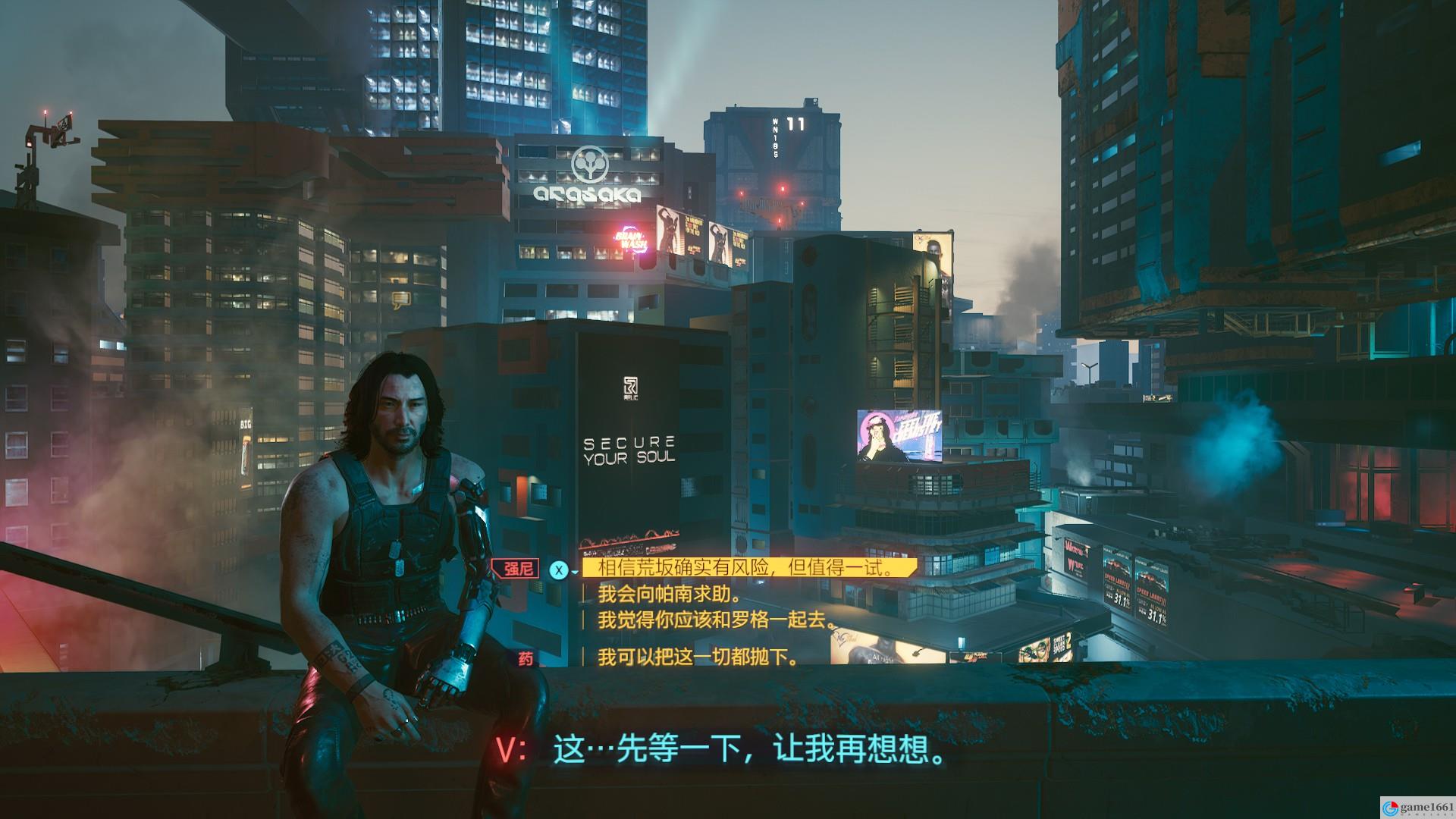 與華子交談之後,V會暈倒在電梯。蘇醒與維克託交談之後,將會跟隨米斯蒂到天臺,強尼要你做出四選一的選擇。(初始為三選一,選擇其一後選」我再想想「 即會變成四選一)
