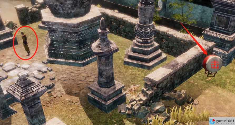 趕至右上角石塔,到石塔右側運勁擊鼓,步驟同上