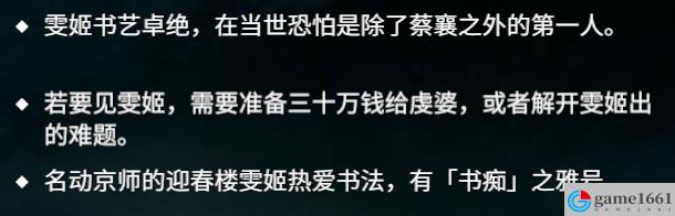 對話虔婆→隨便聊聊→激將之計→雯姬到迎春樓多久了→七歲就能作詩→談論八卦→對老先生發表意見→雯姬如何習字→雯姬學藝的老先生