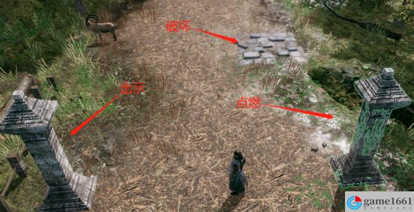 點燃右邊的石柱燒掉藤蔓