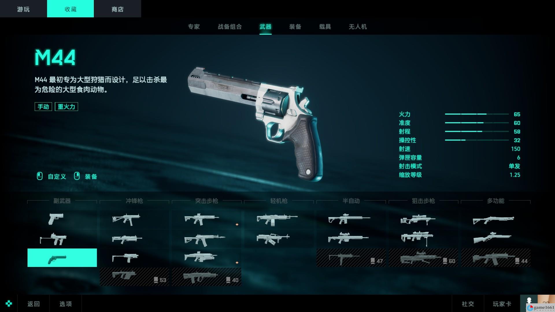 M44,經典左輪手槍,高傷害。初始自帶重型子彈,可以解鎖穿甲子彈。