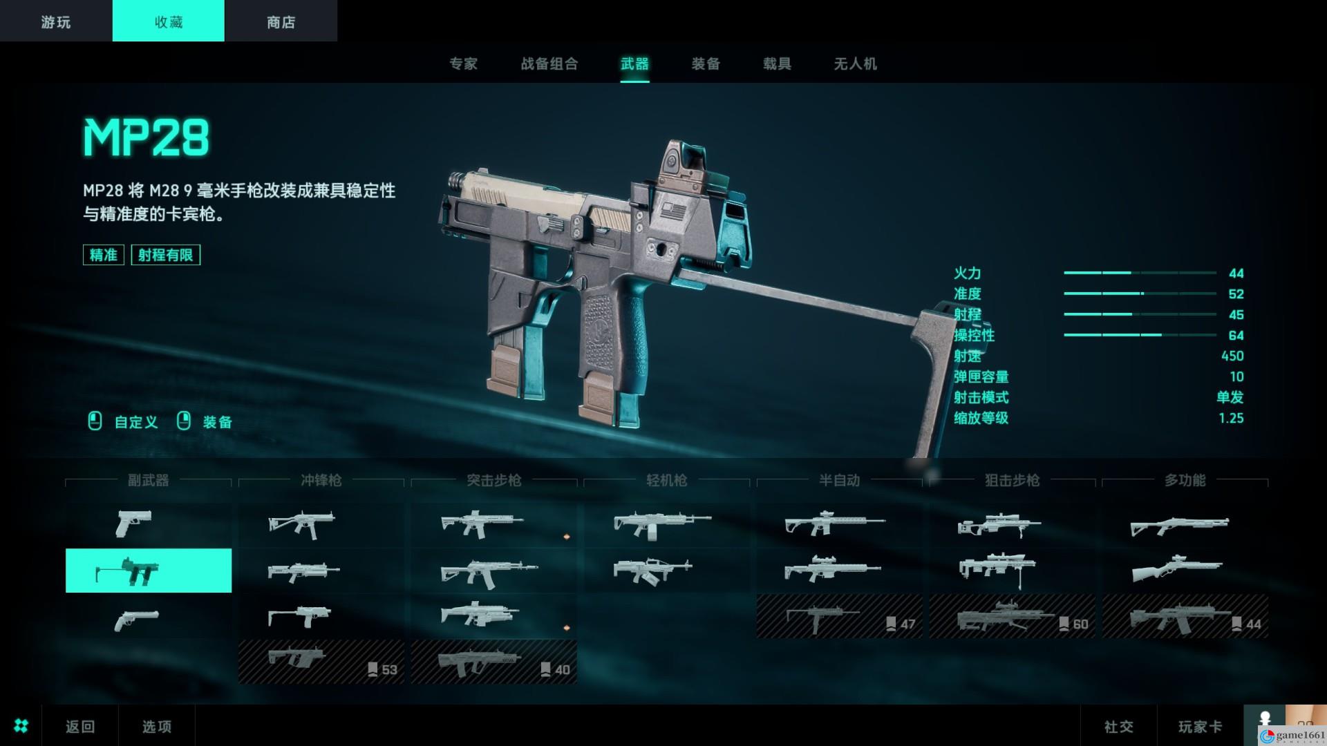 MP28,高達44傷害,射速很快,換彈也很快,手槍中的豪傑,防身利器。