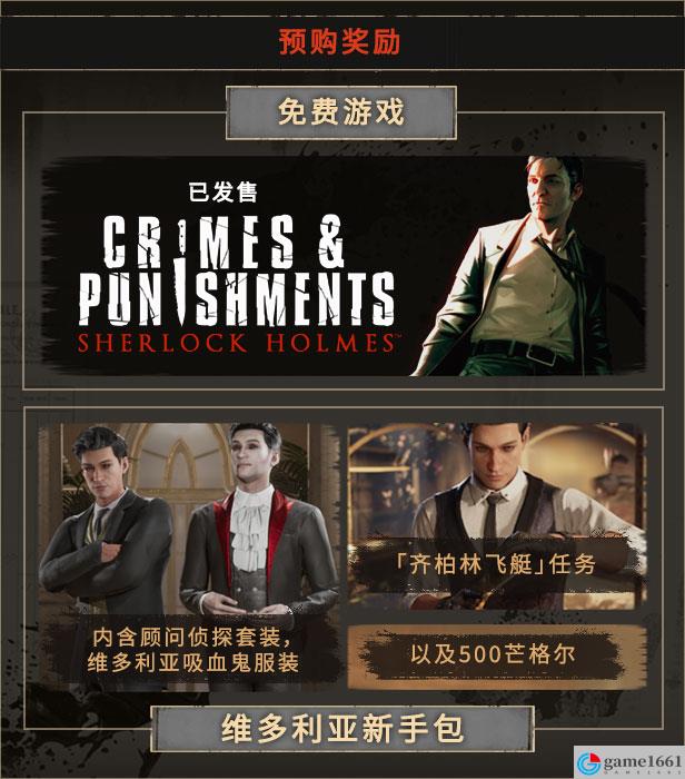 游戲預購的獎勵就是《夏洛克·福爾摩斯:罪與罰》游戲、顧問偵探套裝和維多利亞吸血鬼服裝,還有特殊的齊柏林任務和500芒格爾