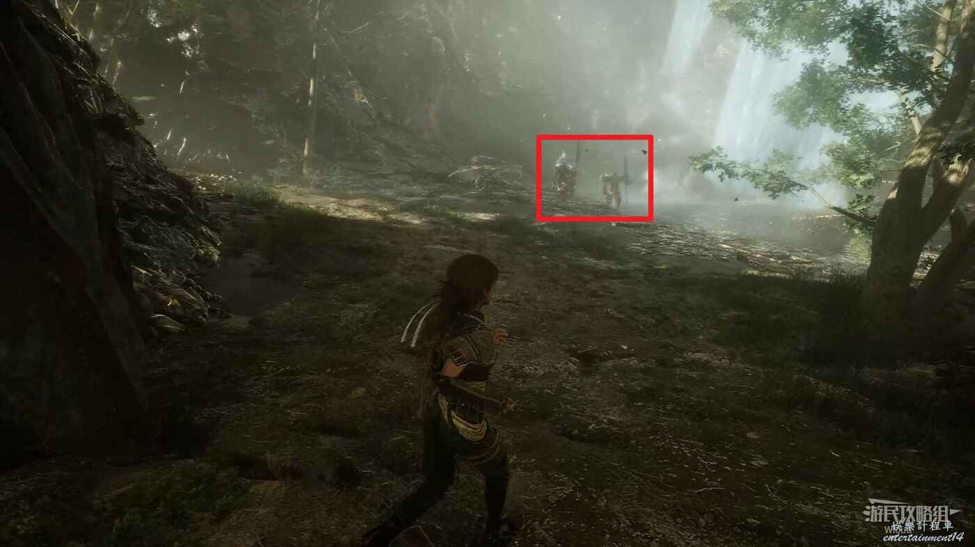 沿路繼續往前走,注意左側有個小道,上面可以撿一個強化材料,跳到底部與巨大經怪互動與其戰鬥。